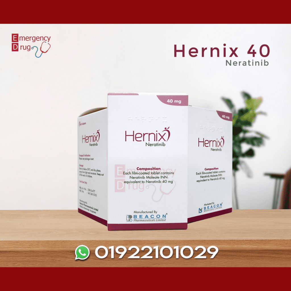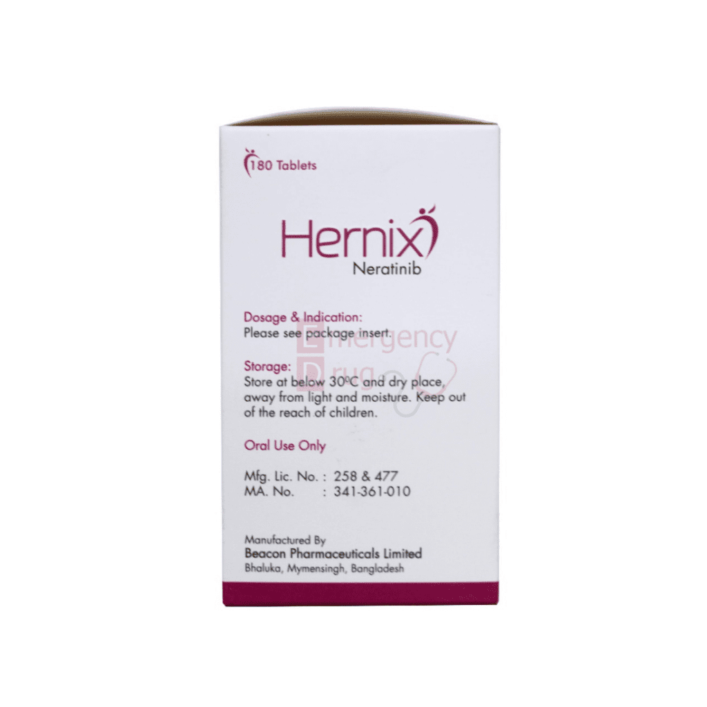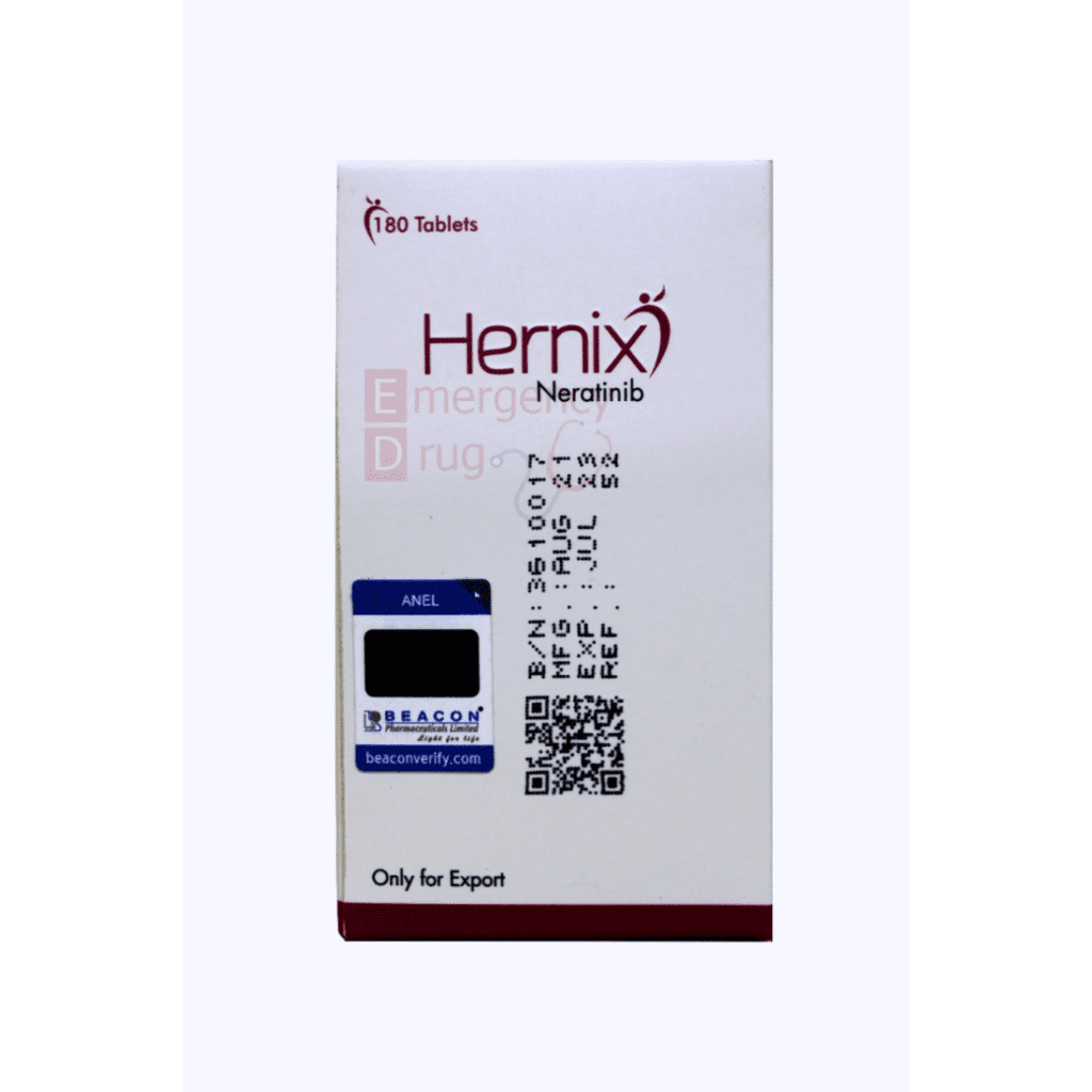 Neratinib is a kinase inhibitor that irreversibly binds to Epidermal Growth Factor Receptor (EGFR), Human Epidermal Growth Factor Receptor 2 (HER2), and HER4. Hernix reduces EGFR and HER2 autophosphorylation, downstream MAPK, and AKT signaling pathways. Therefore show antitumor activity in EGFR and/or HER2 expressing carcinoma cell lines. Neratinib human metabolites M3, M6, M7, and M11 inhibited the activity of EGFR, HER2, and HER4 in vitro. In vivo, oral administration of Hernix inhibited tumor growth in mouse xenograft models with tumor cell lines expressing HER2 and EGFR.
